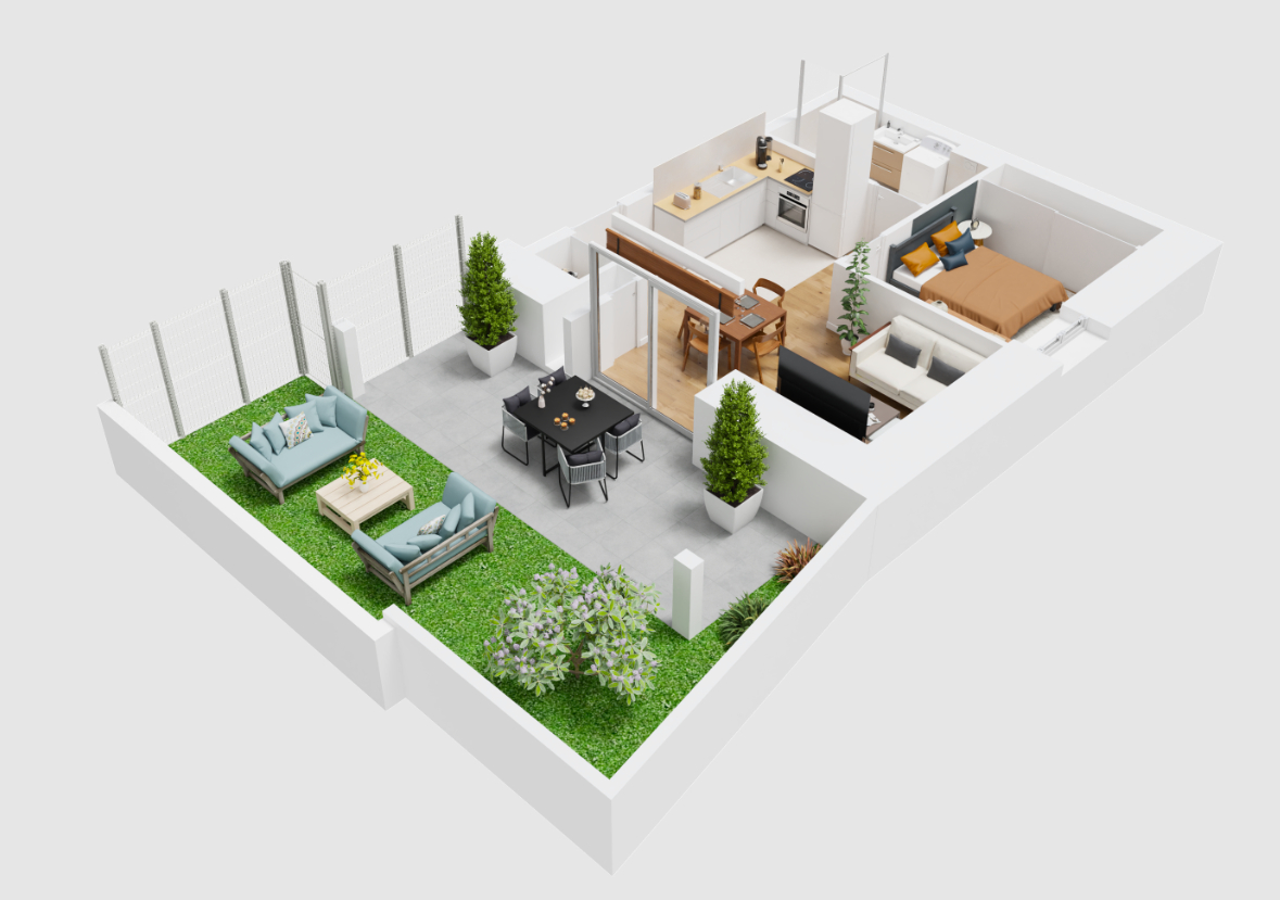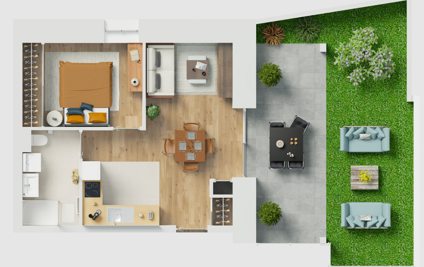 Ces T2 rez de chaussée bénéficient d’un jardin privatif de 25 à 70 m2 en fonction du lot. Des espaces intérieurs bien pensés pour profiter pleinement de votre propriété.