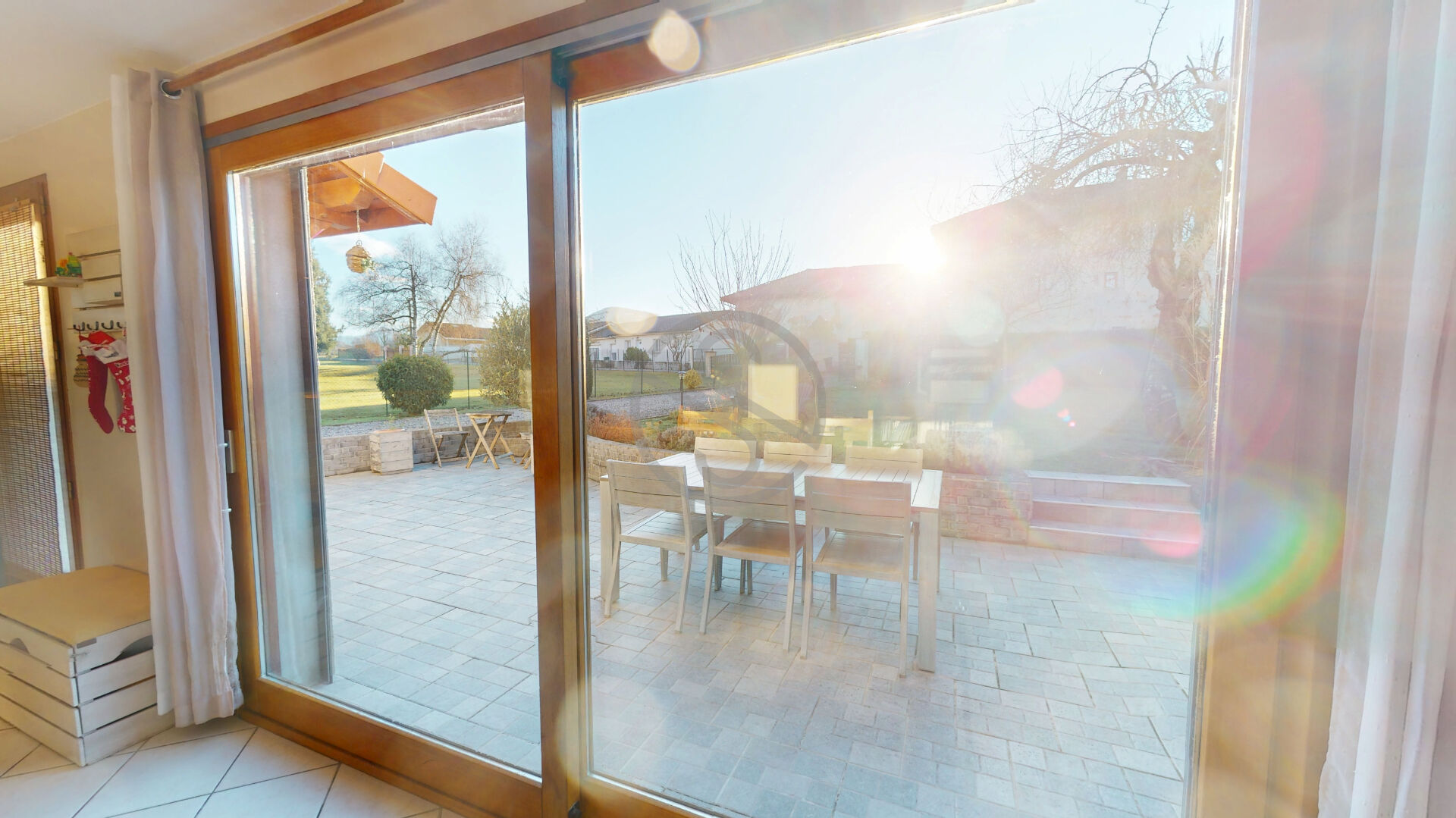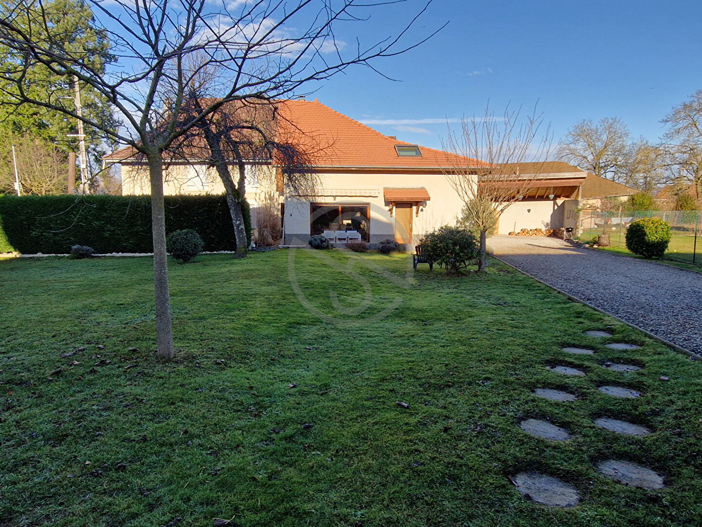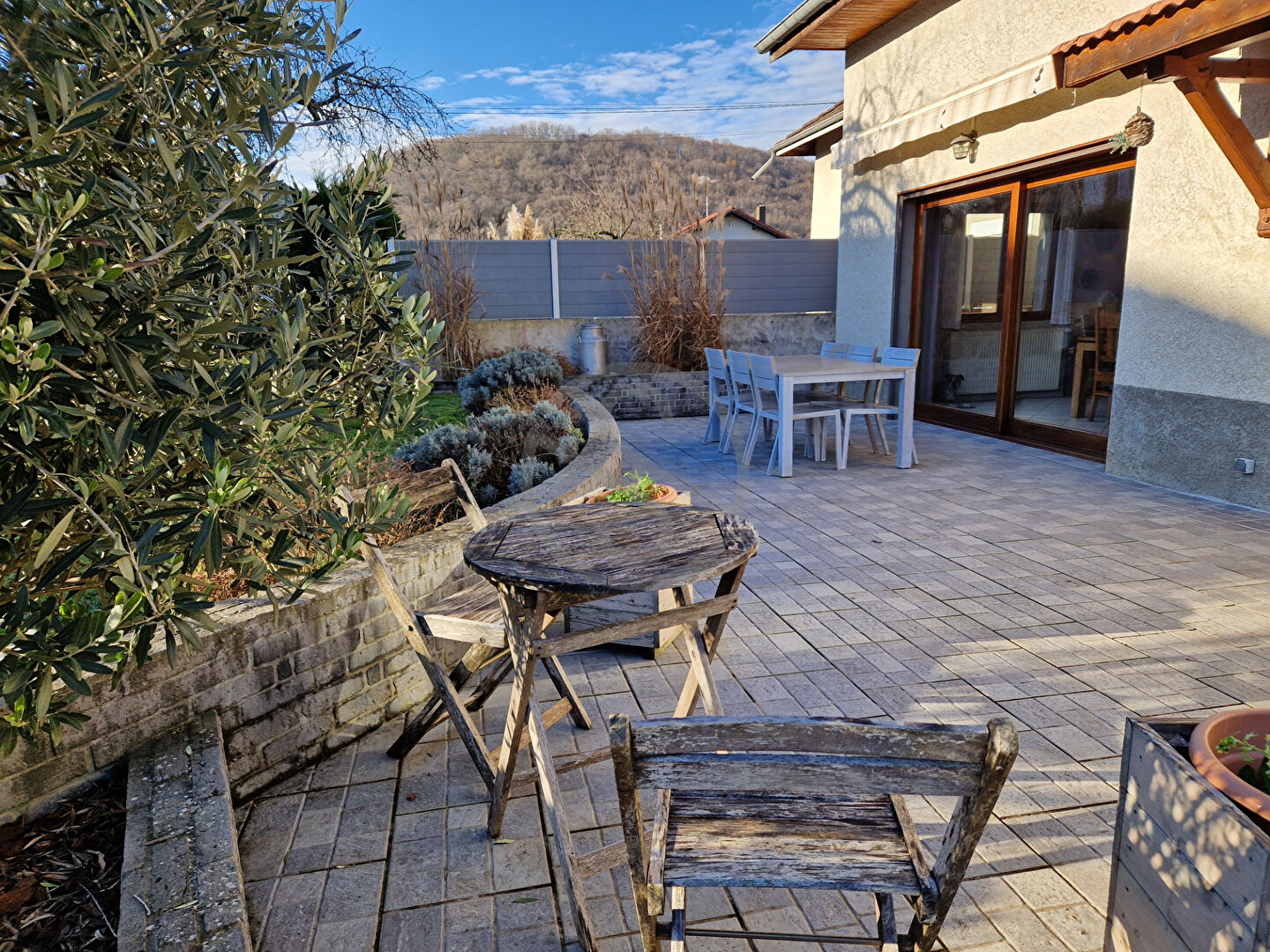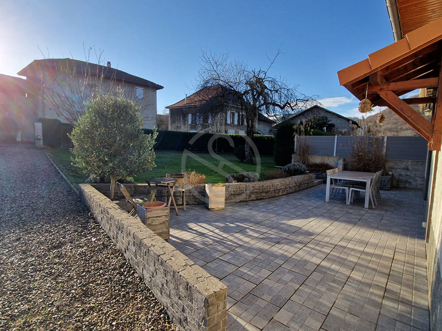 Un beau terrain plat, clos et arboré vient agrémenter la grande terrasse exposé SUD avec son store pour vos belles journée ensoleillée.