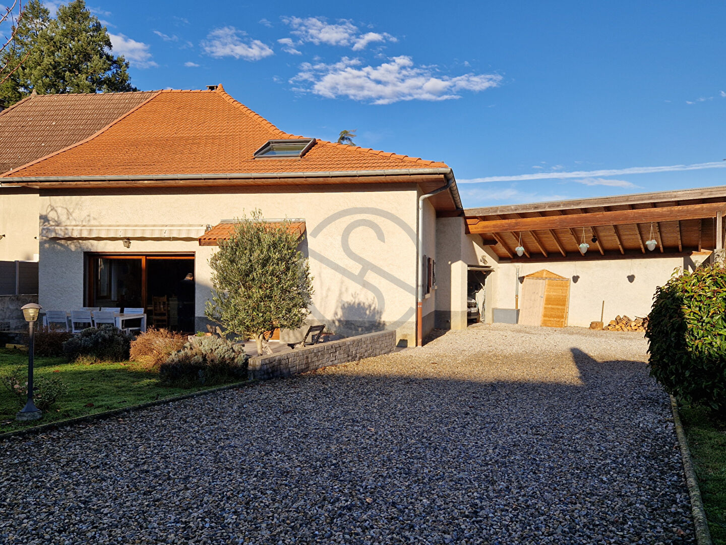 Vous accédez sur la propriété de 700 m2 par un portail électrique et son allée en gravier.