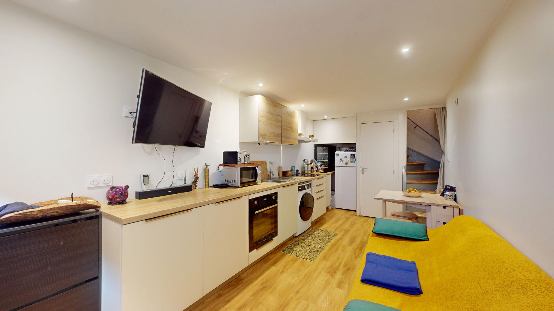 une agréable pièce de vie avec cuisine équipée, ainsi qu’un toilette indépendant.
