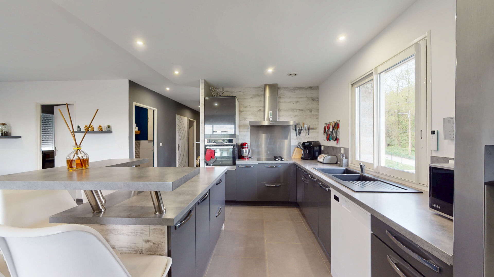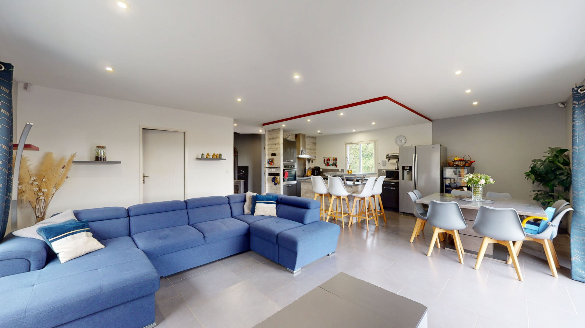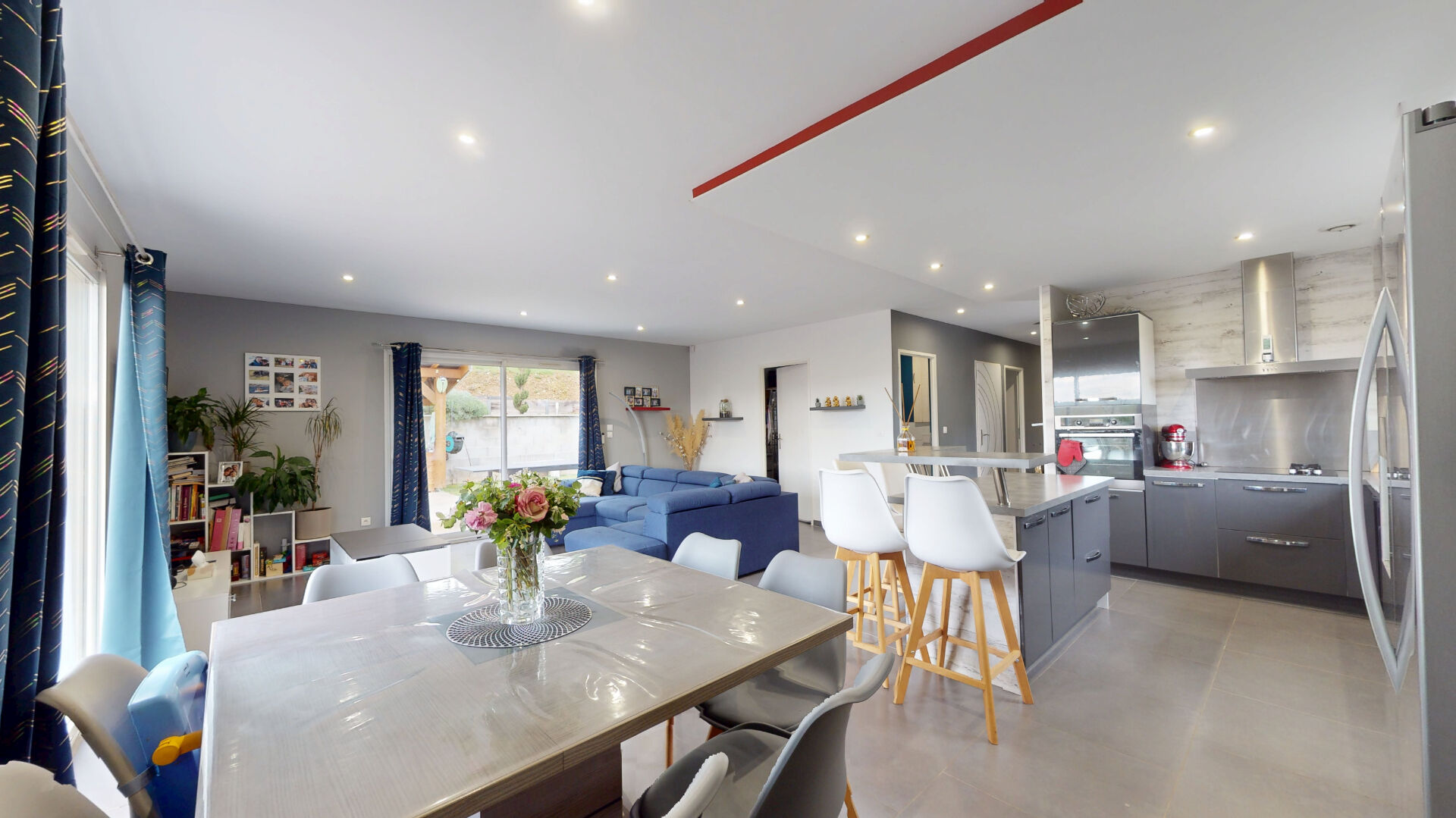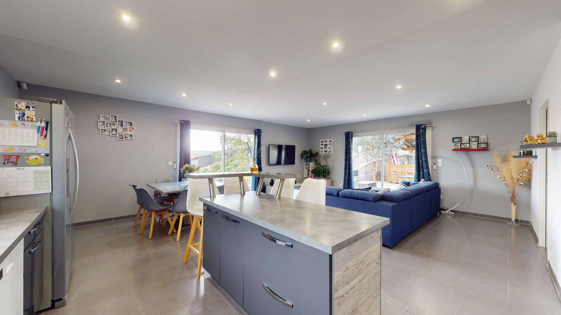 La villa vous propose un espace de vie de plain pied de 98m2 habitable sur un sous-sol/garage complet. Vous aurez plaisir à découvrir un hall d’entrée, une magnifique pièce de vie avec cuisine équipée ouverte, traversante en accès directs au jardin, à la terrasse aménagée et sa cuisine d’été. Le coin nuit se compose de 3 belles chambres avec dressing, une superbe salle d’eau avec douche à l’italienne, un bureau ainsi qu’un WC indépendant.