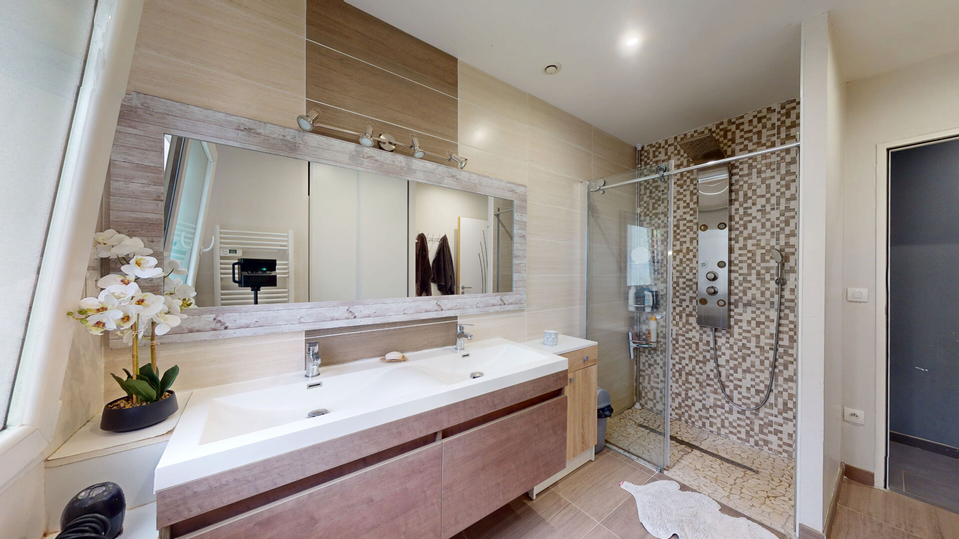 Le sous-sol complet vous permettra d’accueillir jusqu’à deux véhicules et d’utiliser de nombreux espaces de stockage supplémentaire. Vous bénéficieriez également d’une grande pièce complémentaire aménagée (idéal télétravail), d’un coin cuisine, sanitaire et douche.