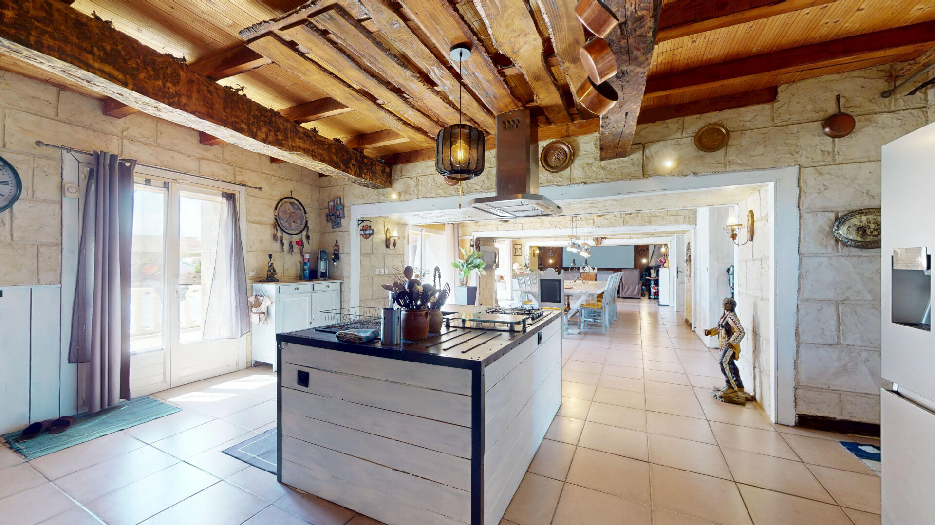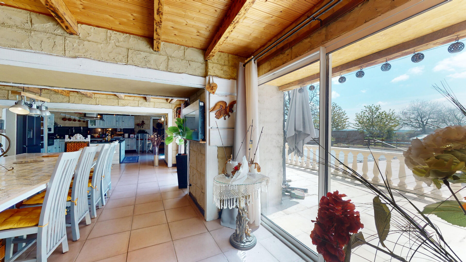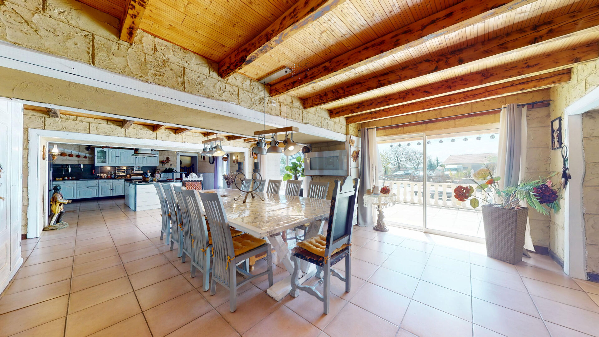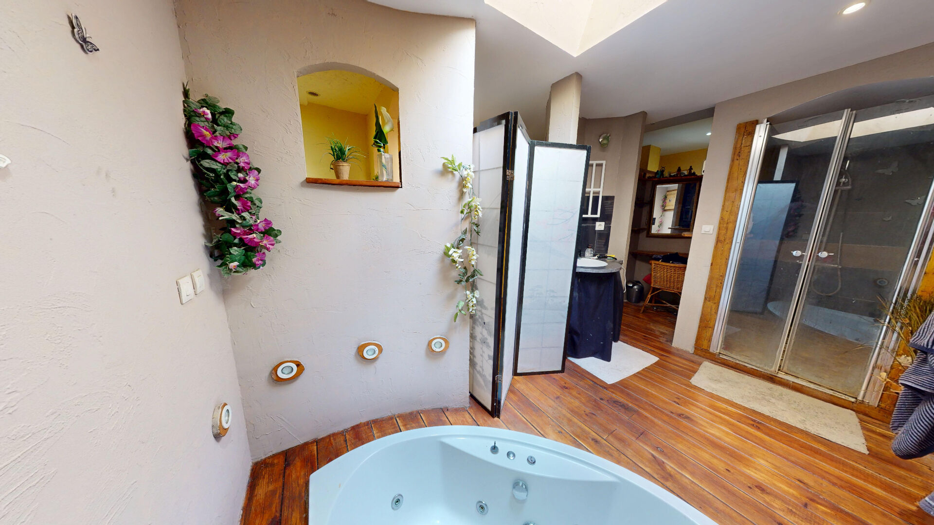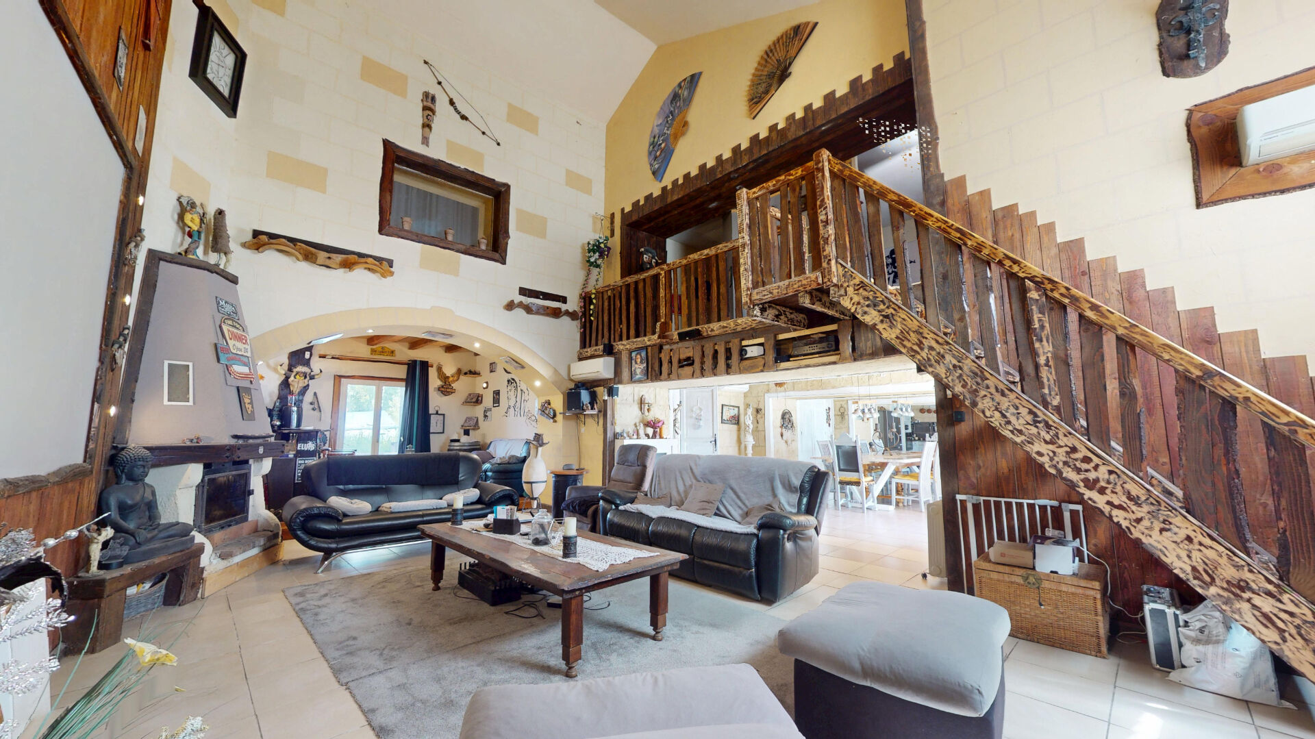 Sur une parcelle de 2500m2, dont une partie est constructible (possiblement à détacher), dans un environnement calme et lumineux, très grande maison en pisé, d’une superficie totale de 260m2 environ, constituée d’un immense double séjour de 110m2 entièrement ouvert sur la cuisine équipée et aménagée, avec îlot central de cuisson. Salon cathédrale dans la continuité et un espace bar pour accueillir vos amis dans un esprit convivial…