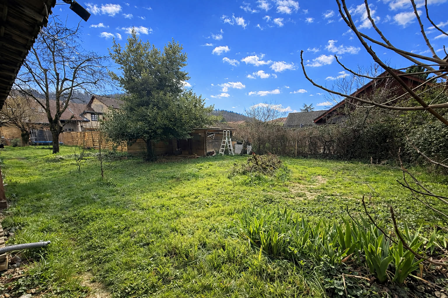 Côté extérieur, une grande terrasse donnant sur un terrain clos et arboré.
