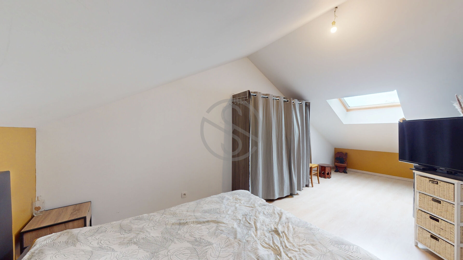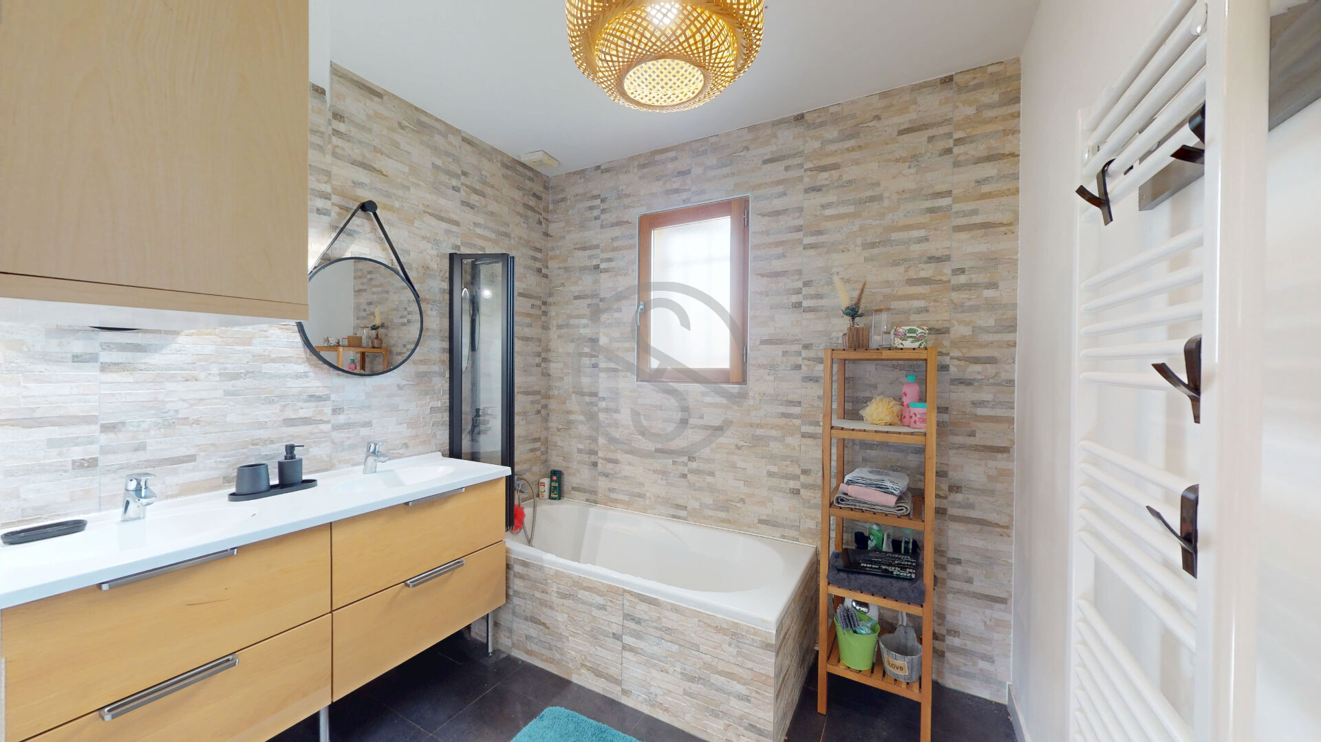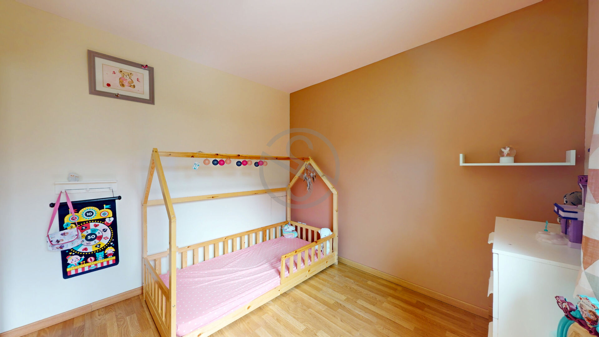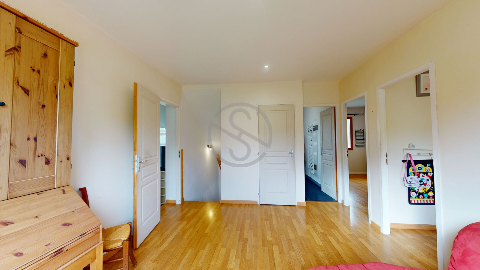 A l’étage, trois grandes chambres lumineuses accueillent toute la famille, ainsi qu’une salle de bain fonctionnelle avec WC indépendant.