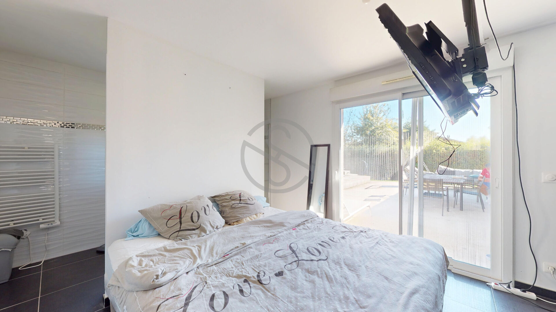 L’extérieur vous offrira quand à lui plus de 1044 m2 de terrain avec ses terrasses côté SUD OUEST et celle côté SUD EST de 50 m2 avec sa piscine semi-enterrée.