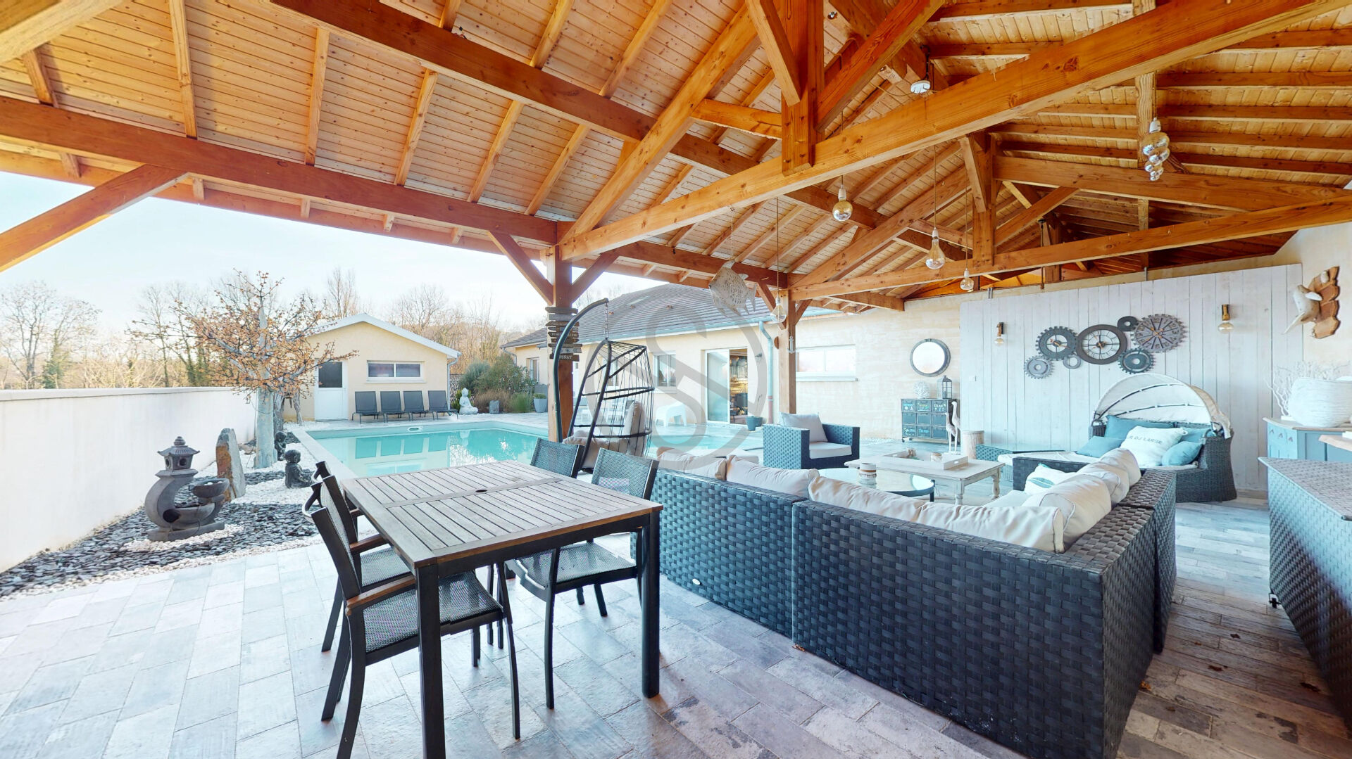 Les extérieurs ont été pensés comme un véritable lieu de vie à part entière avec plusieurs terrasses un four à pizza différents, espaces détente, une piscine enterrée harmonieusement intégrée ainsi que des zones couvertes permettant de profiter de l’extérieur en toute saison